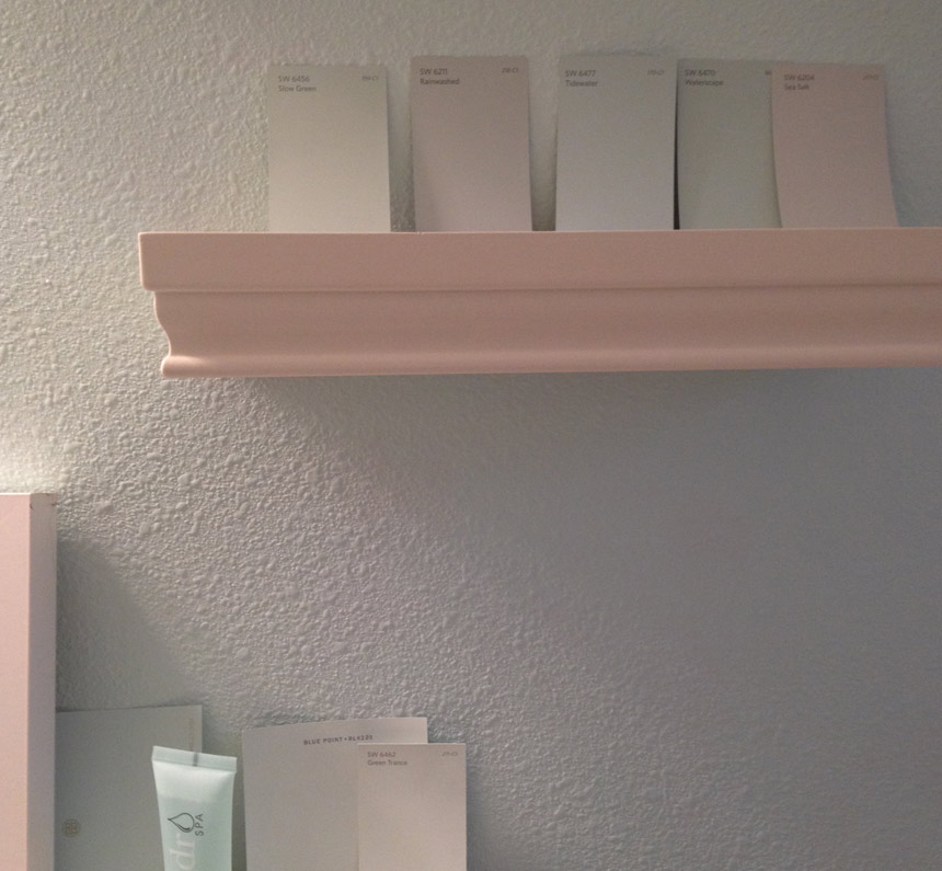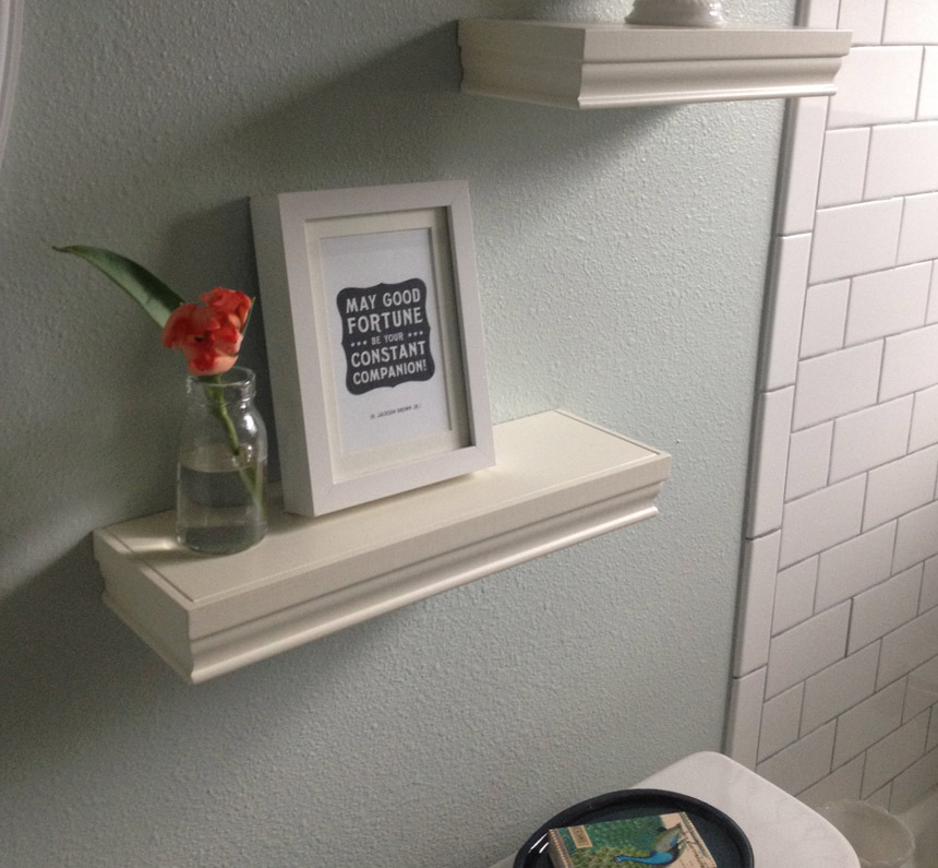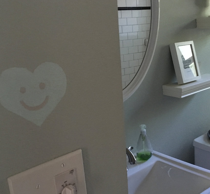 Yes, that is a good enough reason for a whole post :). What color, you ask? I thought I knew. I wanted to paint the bathroom a nice, tranquil, sea-mist/watery color (I was trying to match the little tube of shampoo I kept from a hotel that used that same, serene color on their walls). But then all the little swatches I brought home from Home Depot started looking the same. Ack! This heartsmiley is the result of painting the whole bathroom, then re-painting it all over again, with a less obnoxious version of the same color. The smiley is the only remaining bit of that first (too-bright!) color, peeking out from underneath. Heee! Maybe that first coat of paint wasn't a waste of time after all.