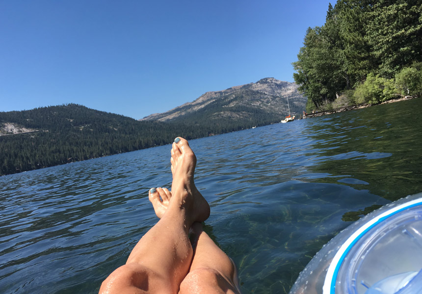A perfectly spent summer afternoon at my favorite lake in the world, floating on rafts with most cherished family. I grew up near this lake, and have sooo many happy memories from all different times in my life here. So it was extra special that our two nieces traveled from both sides of the country to meet us in this spot! This cheery yellow leaf I saw floating by sums up the mood. And this haiku...
