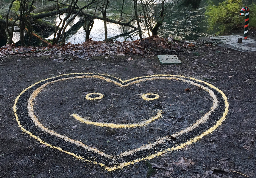 So it seemed like the perfect time to share my friend Becky's thoughtful idea for a smiley: birdseed mandala! We made this one back in December, for the creatures of Laurelhurst Park, while meeting up for my birthday. The birdseed, hanging out in the park with my dear friend, plus the smiles from people who wandered by, were all together a perfect birthday gift. The next day I came back to check on it, but there was nothing left but a heart-shaped cluster of ducks. Maybe it was their birthday, too?!